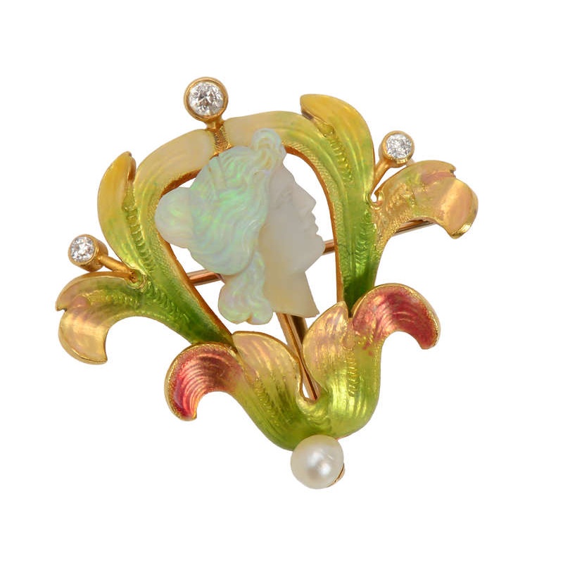 The female head was placed amid leaves enriched with lustrous, translucent enamels in sea shell pink, coppery coral, and a range of yellow greens. Typical of the Art Nouveau period, it draws inspiration from nature and is organically lyrical in feel.