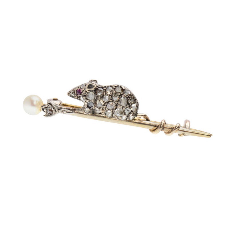 A rose diamond studded mouse balances atop a gold and pearl brooch creating an endearing jewel.