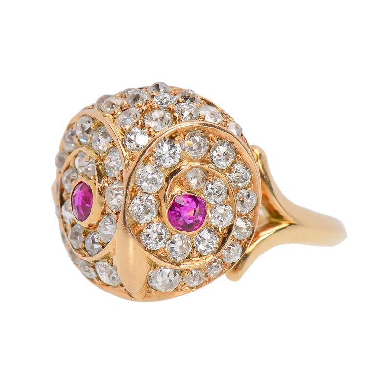A whimsical owl motif ring of 14k yellow gold charms with a pair of faceted ruby eyes, total weight of .16 carats. A lovely use of forty-one antique diamonds, total weight of 1.45 carats (H-I color; SI1-3 clarity) takes on a spiral form of feathers winding around the red ruby eyes.