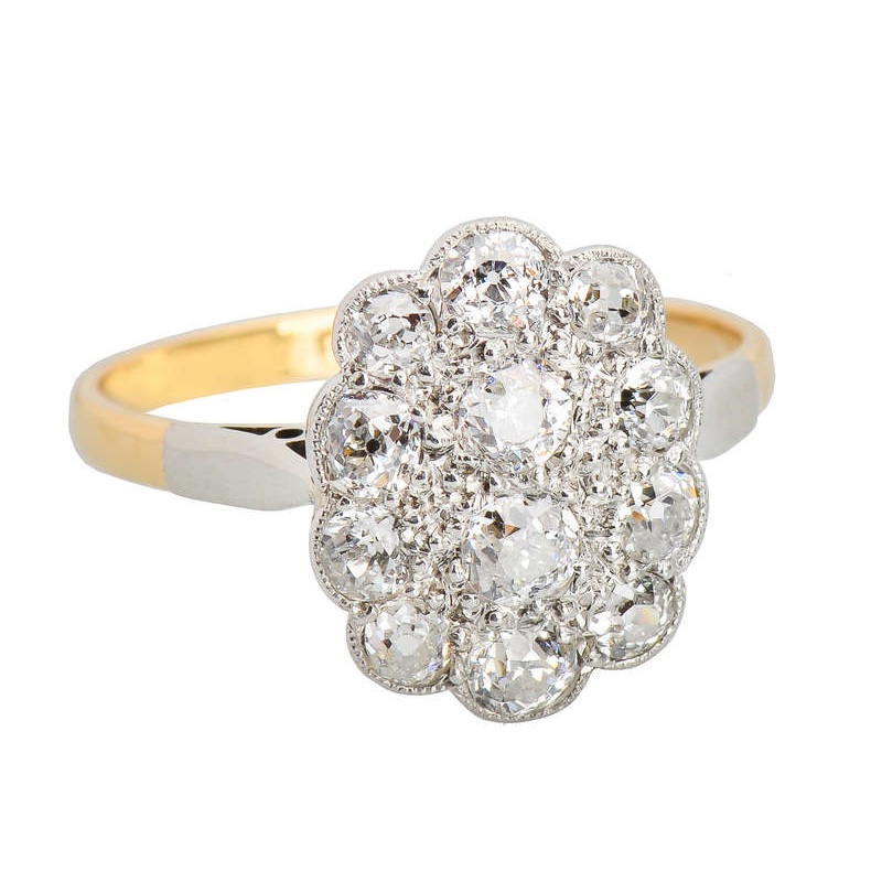 A gathering of shimmering antique diamonds (always conflict free and eco friendly) blend together in a medley of refraction and brilliance.Old chunky European brilliant cut diamonds together add up to 1.30 carats. White and clear, nothing but radiance meet