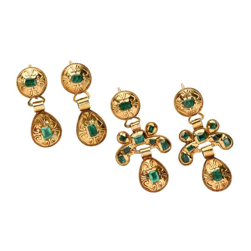 Fabricated in 18k yellow gold, these are quintessentially 18th century in every regard. Brazilian table-cut natural emeralds grace each section with their vibrant, true green hues.