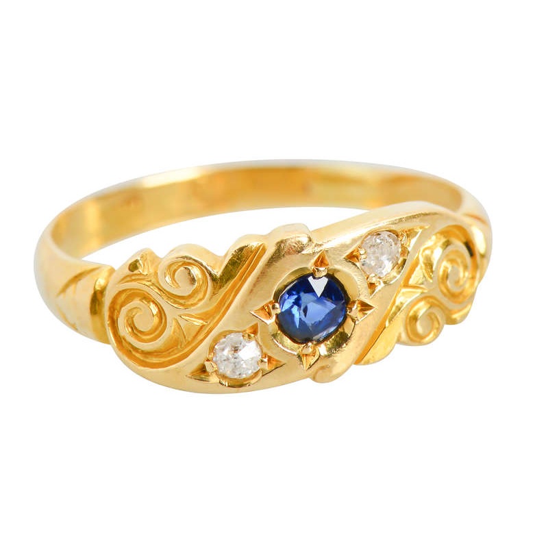 In 18k yellow gold, this English ring is studded with a natural sapphire and two diamonds.Dating to circa 1910, a swirled gold top accented by deeply carved designs holds one sapphire of .10 carats and two diamonds also a total of .10 carats. Sitting low o