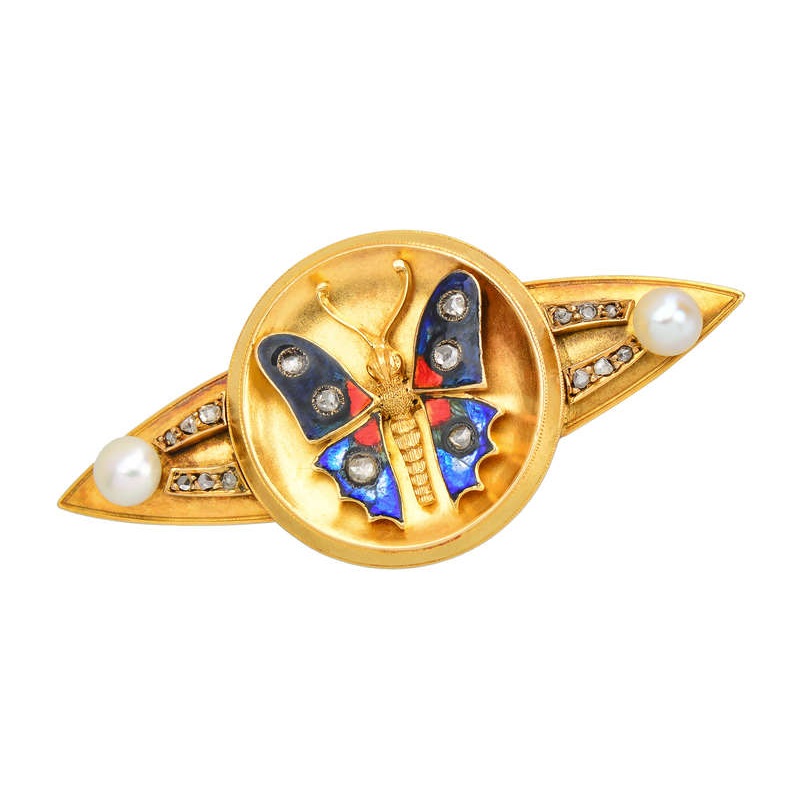 The wearable treasure from the Victorian era was inspired by the ethereal butterfly translated into 14k gold, enamel, diamonds and pearls.