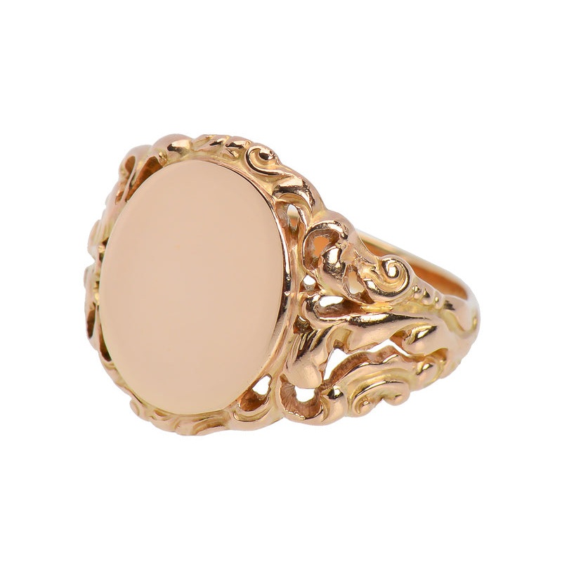 Striking from every angle, this ring is artfully designed with open work scrolling leaf designs appointing the 10k yellow gold mounting. A signet ring you've dreamed about forever and a day is ready and available for your monogram or initials engraved in u