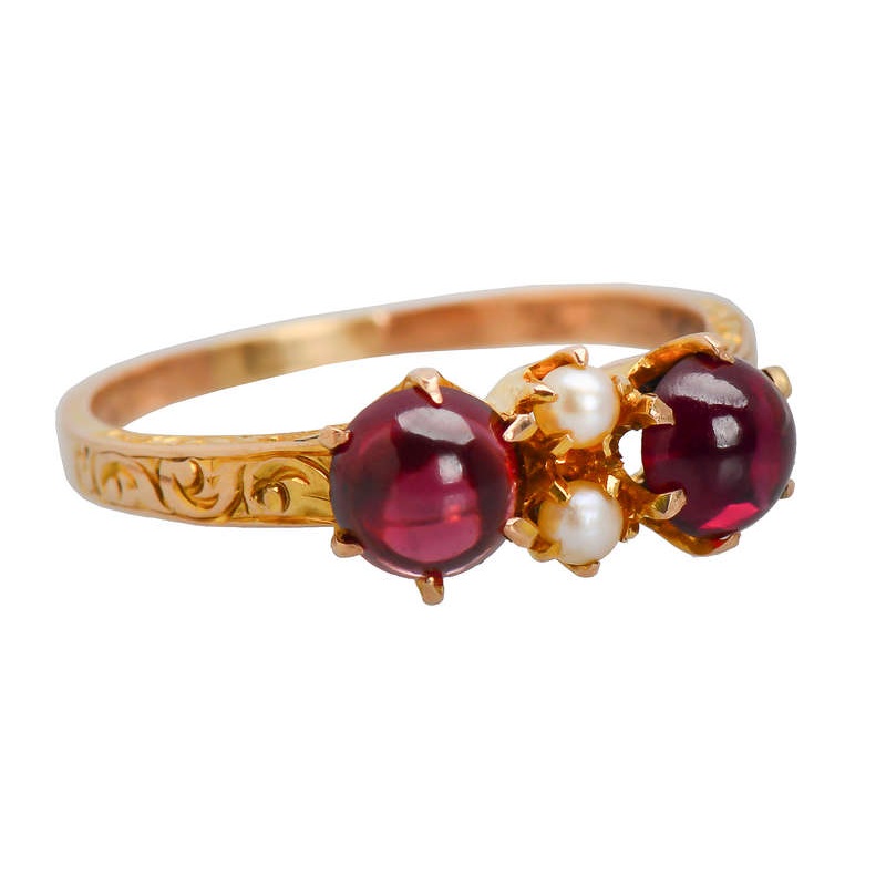 Garnets that simmer with pink and plum tones are placed beside two natural saltwater seed pearls.