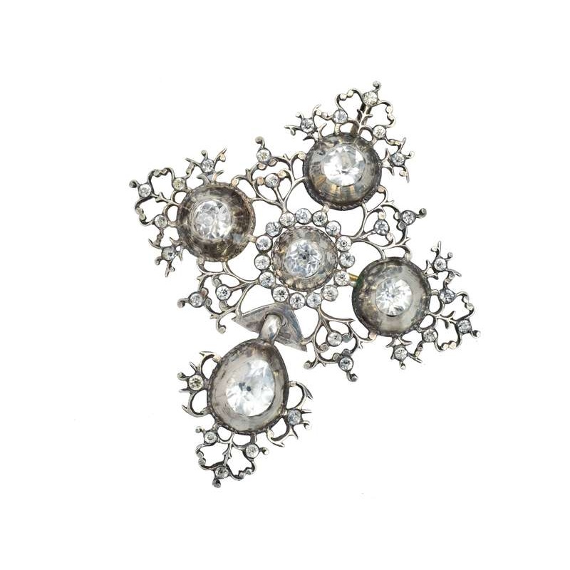 The pendant is a trove of “C”? curve scrollwork set with a central round faceted rock crystal surrounded by 15 more of a smaller size. The largest gems are set in mounds of silver with bases detailed in a beaded design.