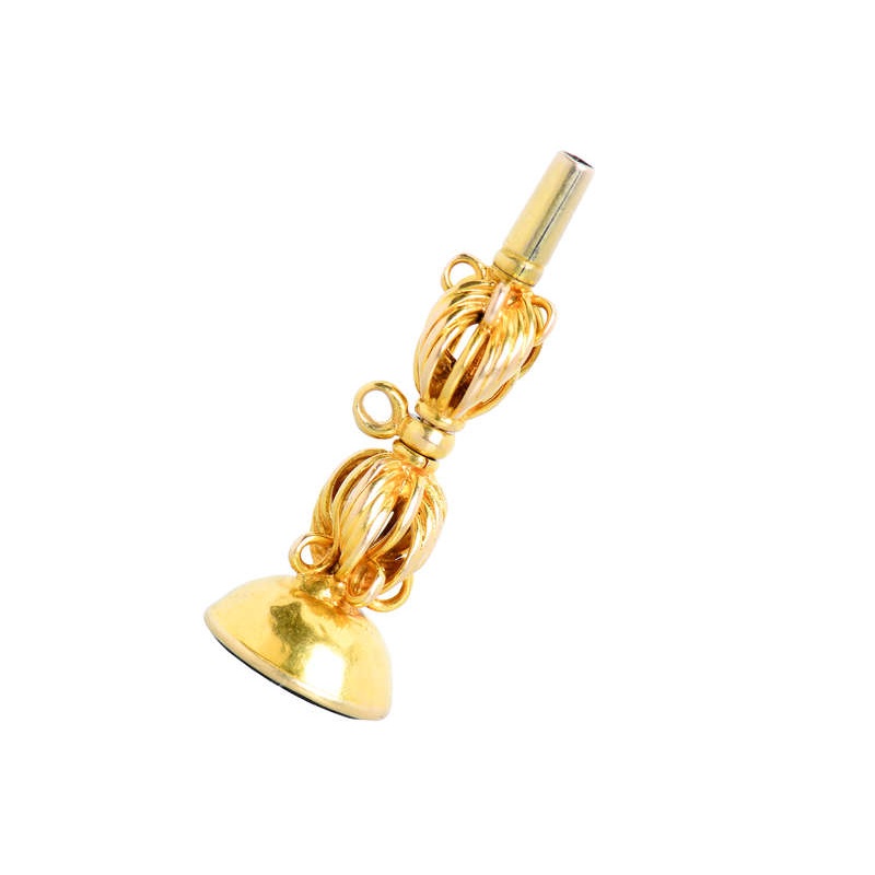 A watch key, fob and pendant charm, the 18k solid yellow gold decorative top is arranged in two sections with a pendant hanger in between. Beautifully sculpted, note the gold wire-work successfully built up to form undulating forms and loops.