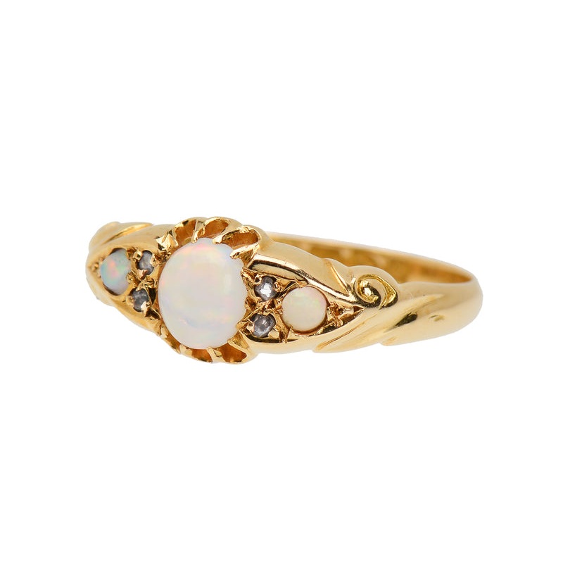 Three cabochon opals dot the surface with a total of .55 carats. The center sits amidst a buttercup setting. Four rose cut diamonds shimmer (.04 carats total, color K-M, clarity SI2-3).