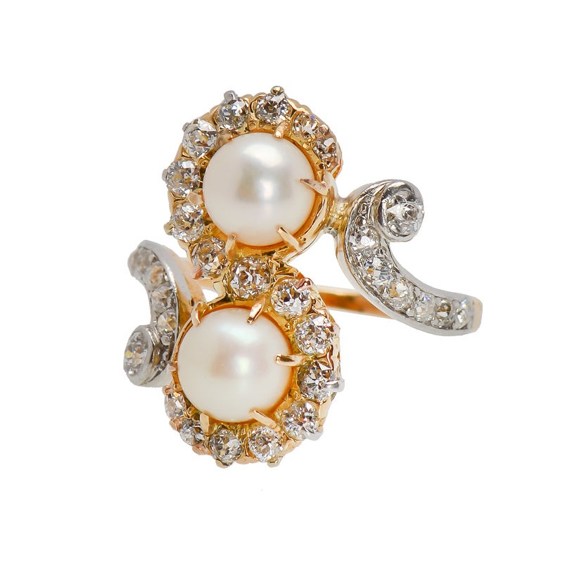 Quintessential elegance"...the vertical orientation of the platinum-topped ring will give the illusion of lengthening the hand. Graceful work from the turn-of-the twentieth century shows off a variation of the "moi et toi"? ring or a me and you ring.Swirls