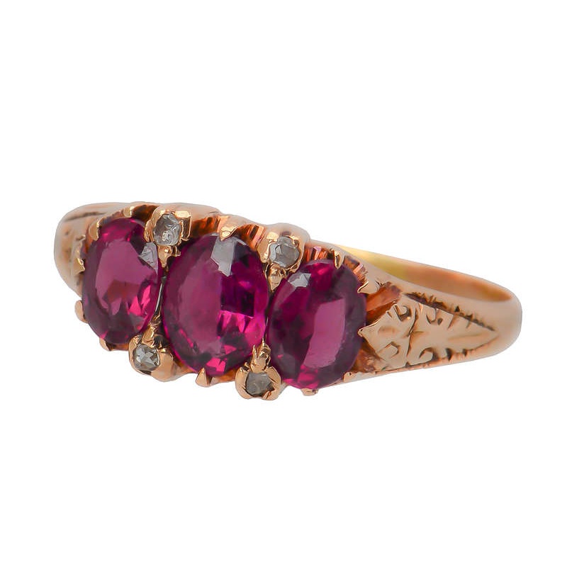 Three rhodolite garnets radiate hot pink and purple shades of color in this antique three-stone ring. Faced with an oval in shape, the three garnets total 1.10 carats. For additional glitter, four rose-cut diamonds (a total of .04 carats) are placed betwee
