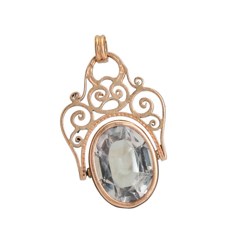 A spinner fob pendant artfully employs tracery and curves all in rose gold.