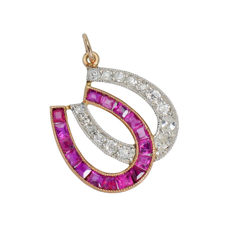 Double your luck? Even better perhaps you believe in making your own? Either way, wear this as a talisman or a homage to the noble horse and your equestrian nature.Half the duo of horseshoes is set with fine red-pink calibr square cut rubies and half is se