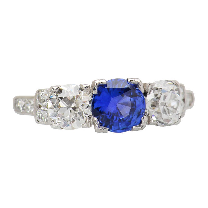 Alive with color and sheer brilliance, this signed S. Kind & Sons platinum ring holds a blue sapphire and two old European chunky and fab diamonds.