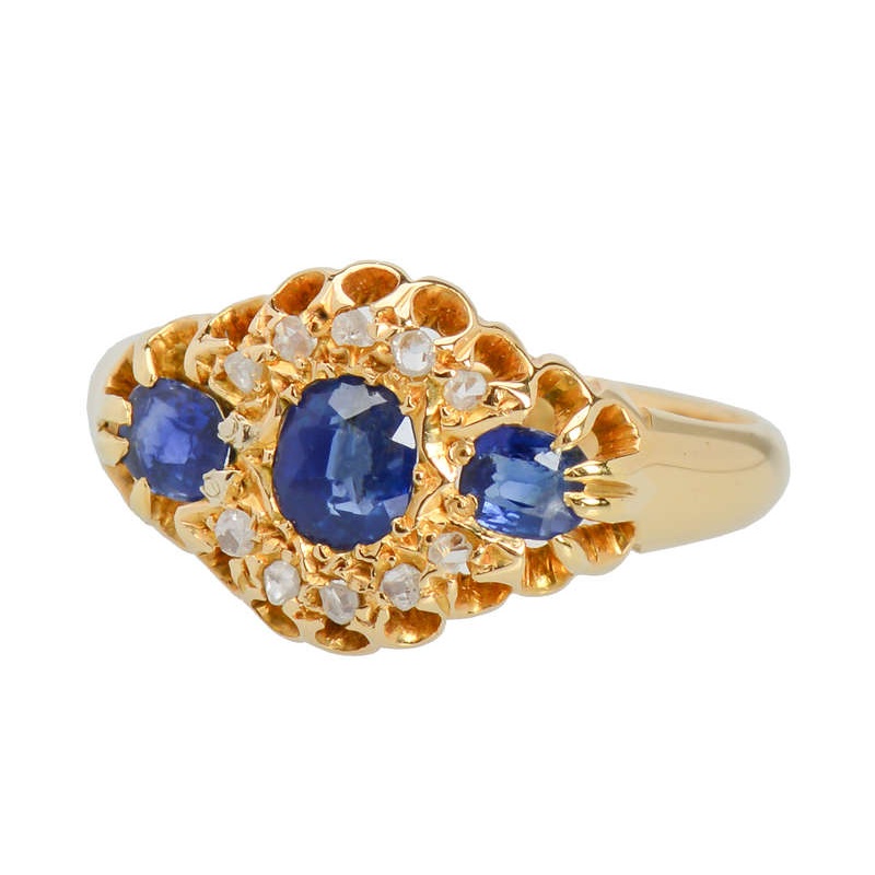 Originating from England in the year 1903, this natural sapphire and diamond ring sits low on the finger for carefree wear.Three natural blue sapphires and ten rose-cut diamonds form a cluster of color and light. A beautiful curving almond shape is created