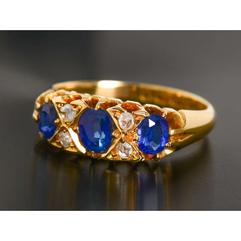 SPECIAL MARKDOWN! EXCEPTIONAL VALUE.Lining up for the performance are three natural, lively blue sapphires with diamond accents placed into 18k yellow gold.Made in the year 1901 in England, looking back during that span Edward I was crowned king, thus mark