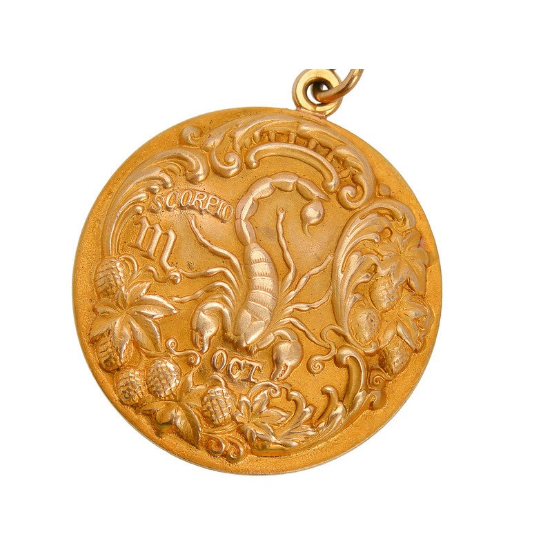From the firm of Sloan & Co. of the fabulous cabal of Newark design and jewelry manufacturing is a solid 14k yellow gold zodiac pendant featuring the sign of Scorpio.Crafted around 1920, the front of the piece displays images in high relief of lobster-like