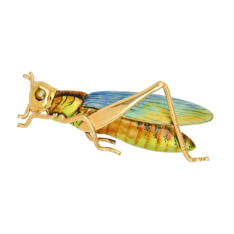 Its wing runs in shades of azure, navy blue and mustard green. In tones of ochre, bronze, black and lime green, the body segments are painted in a manner to accent the three dimensionality of the brooch.