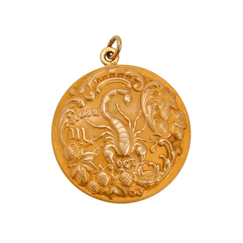 From the firm of Sloan & Co. of the fabulous cabal of Newark design and jewelry manufacturing is a solid 14k yellow gold zodiac pendant featuring the sign of Scorpio.Crafted around 1920, the front of the piece displays images in high relief of lobster-like