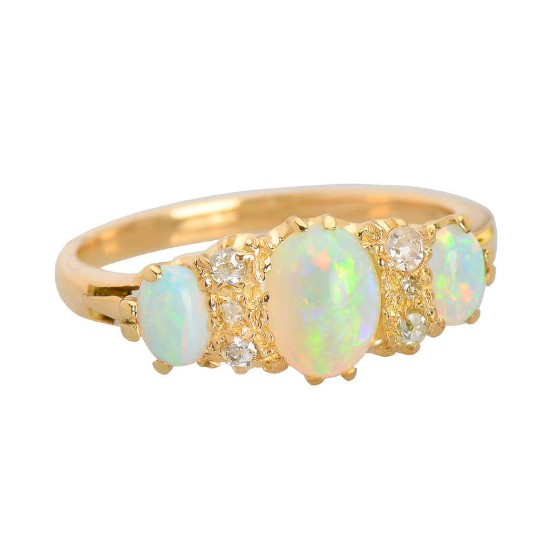 Beautifully balanced symmetry employs opals and diamonds in an arrangement of visual pleasure for this Edwardian antique 18k yellow gold ring.