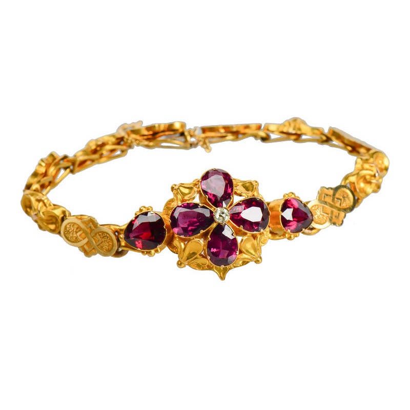 Pure early Victorian sensibilities reign in this classic gold link bracelet set with garnets.