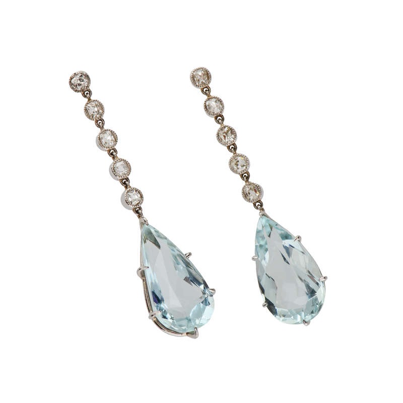 Diaphanous and feminine, these vintage earrings connect diamonds, aquamarines, and white gold in a medium length dangle.