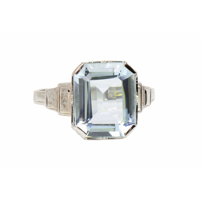 Sleek and serene, it is an aquamarine that feels so good and looks even better.Destined to become your favorite ring, the aquamarine is clear, bright, and sparkles with pale, distinct sky blue.Illusion set, the mounting of white gold stair steps down the s