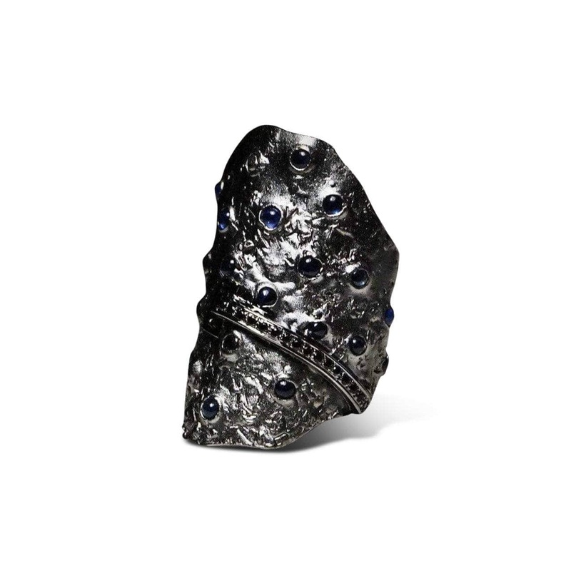 An angled buckle of black rhodium gently slopes across this handcrafted ring. The deepest of black spinels create gorgeous highlights that speak of an ancient time. Dotted across the surface are organic rounded blue sapphires that uplift and inspire. Silve