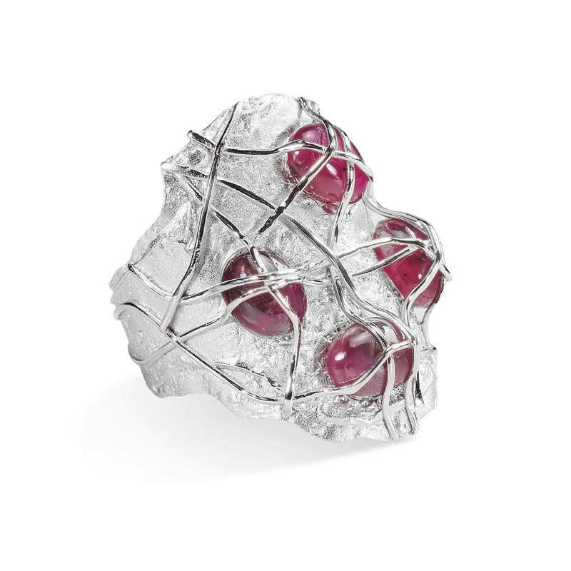 Bright and striking this white rhodium is held captive by its own snaking tendrils as they curve and arc around themselves. Deeply precious garnet gemstones are buried within the design and they fight with all their rich light and luster for prominence and