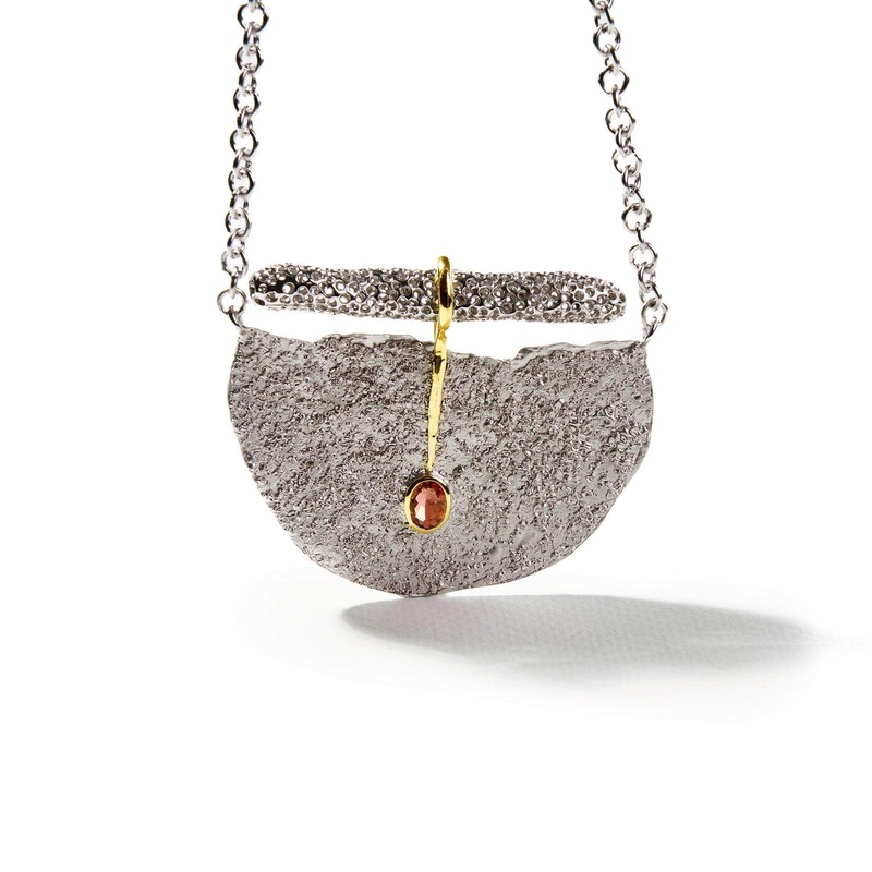 Crafted from the finest 925 silver, this unusual neckpiece flaunts a clash of white rhodium and 18K gold plating on its textured metal surface – a signature hallmark of disruptive style. At the heart of this daring piece of jewelry lies a natural pink tourmaline infusing the piece with a vibrant burst of color. Designed a a singular piece, this contemporary necklace boasts an unmatched individuality rebelling against the monotony of mass-produced jewelry.