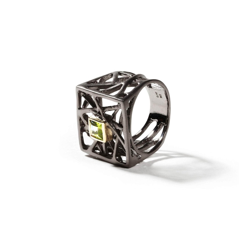 Ultimately foursquare, a architectural ring with a peridot core shining through the entanglement of a silver structure.Metal: 925 SilverStones: PeridotPlating: Black Rhodium, 18K GoldWidth 20 mmBand wide 7 mmLength 20 mmWeight 9.47 g