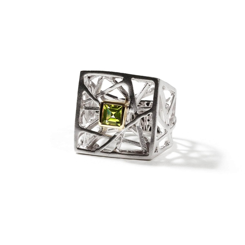 Ultimately foursquare, a architectural ring with a peridot core shining through the entanglement of a silver structure.Metal: 925 SilverStones: PeridotPlating: White Rhodium, 18K GoldWidth 20 mmBand wide 7 mmLength 20 mmWeight 9.49 g
