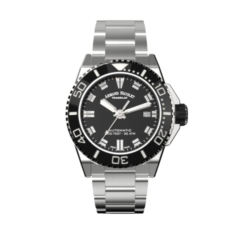 Calibre AN200 for Date (based on ETA 2824-2 modified per Armand Nicolets specifications). Dial with luminous indexes and hands. Case with antiglare treated sapphire crystal. Screwed back. Turning black ceramic bezel.