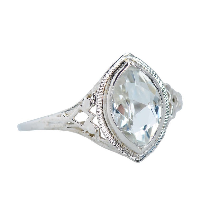 A marquise shaped and faceted natural aquamarine of an estimated 1.3 carats is set off by its lovely sheer blue color. Placed into 14k white gold bezel with lacy details, the cool gemstone just radiates highlights of arctic blue. Art Deco all the way, this