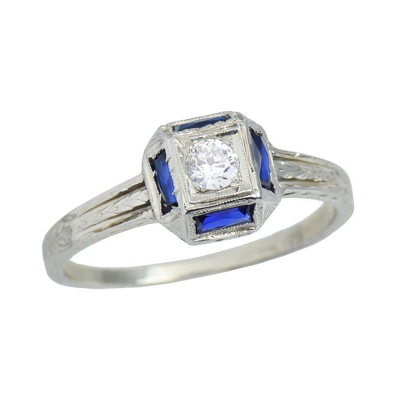 Four rectangular cut synthetic sapphires (correct for the era) adorn the sides as mille grain beaded edges and open work embrace the gemstones. A total weight of .24 carats for the sapphires add color to the whole.