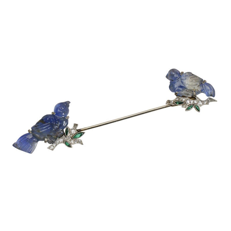 We have all seen carved opal or emerald, coral or amethyst, but carved sapphire? Yes, Art Deco in date around 1925, it is a fantastic jabot brooch with hand-carved birds, one at each end. Lovingly sculptured from natural sapphires, each bird is distinct. A