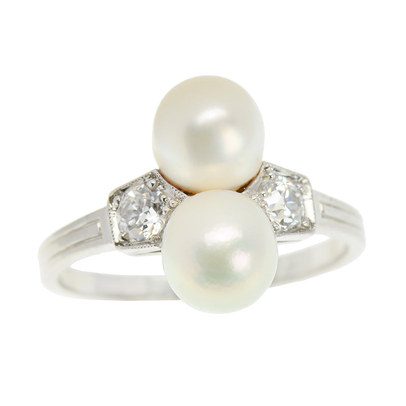To bring back to natural pearl in all its glory, is a platinum and diamond ring. Each pearl averages 6.6 mm in diameter and both are creamy white with hints of greens and pinks.