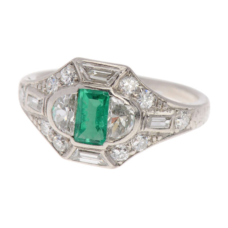 Two half moon diamonds, two trapezoids, another two baguettes and a flurry of old cut diamonds (and that verdant emerald) are all set into platinum.