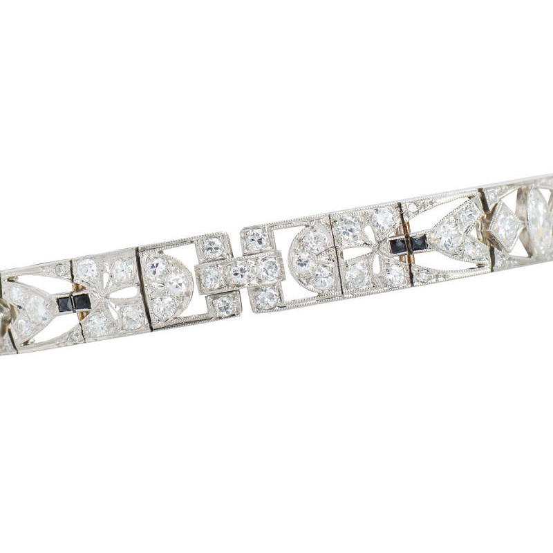 With a total diamond weight of 5.78 carats in a combination of and with a color of G-H and clarity of VS2-SI1, it is a glittering, sensuous adornment for the wrist. The design is unusual and is created with pure Art Deco sensibilities.