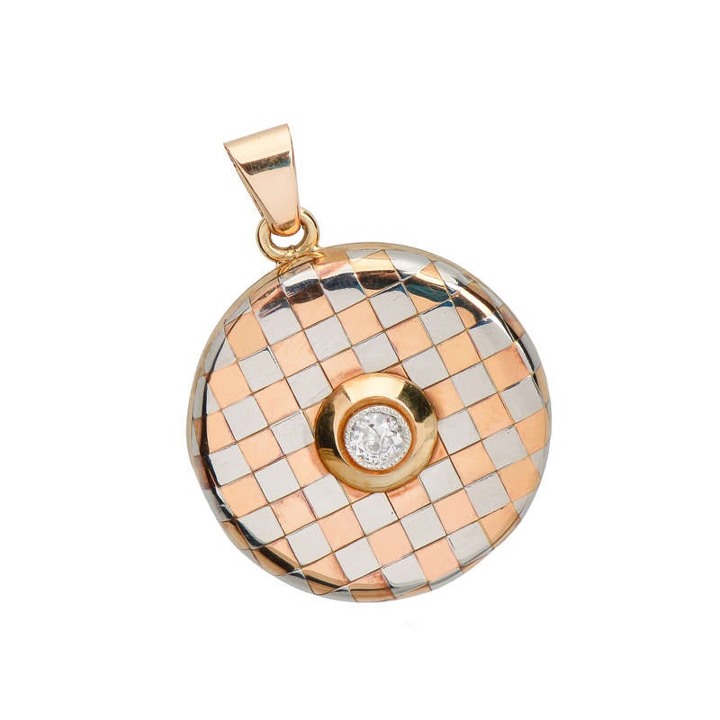 In platinum topped 14k rose gold, the front cover holds a checkerboard pattern. The remainder of the pendant is 14k rose gold. The interior still retains its two rims and one glass for a photograph. clicking closed tight with a snick, it retains its original bale.