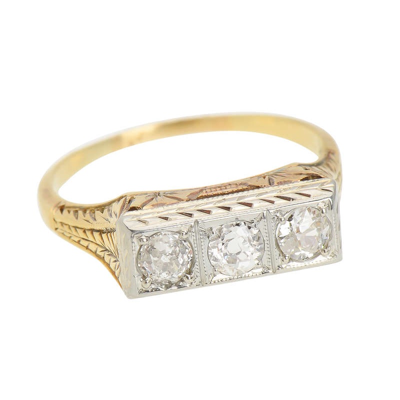 Three dazzling old European cut diamonds sit horizontally across this finger in this authentic Art Deco era ring.