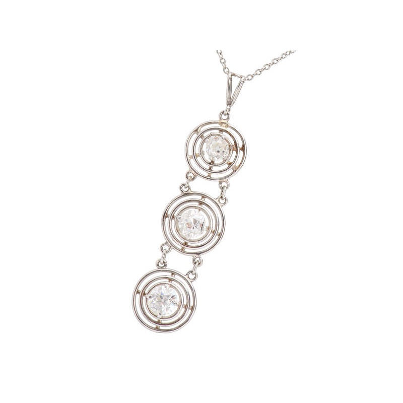 Mesmerizing, this three part pendant makes the most of antique diamonds and steely gray platinum.With a total weight of 1.10 carats, each diamond graduates in size along with the diameter of its setting. Three open circles result tiered and delicate (but s