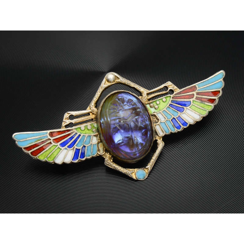 Vibrant and mysterious, this winged scarab brooch comes to us from the Art Deco Egyptian Revival period.