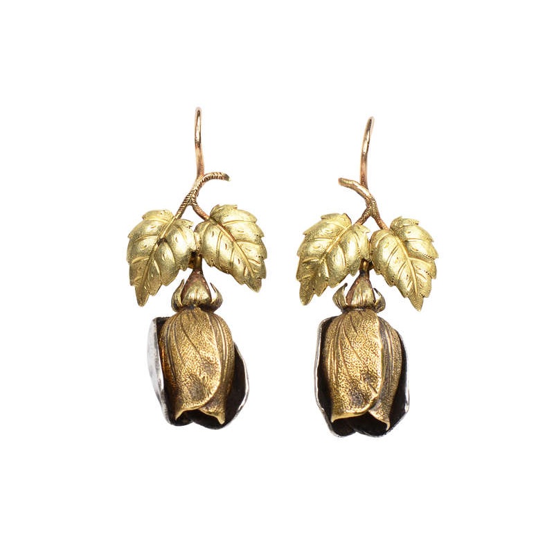 At the back, the roses are encased in two more petals of sterling silver. Even the tops of the buds are decorated with tiny gold sepals. Edwardian, they date to 1915. Modern shepherd’s hook ear wires are 10k yellow gold.