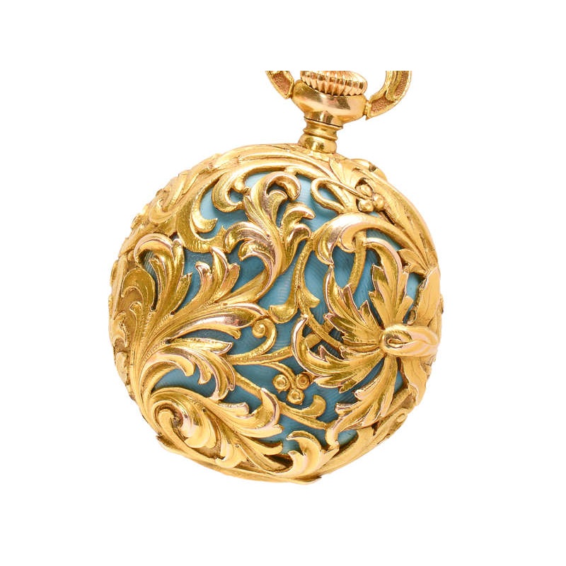 In 18k yellow gold, the cover depicts sinuous acanthus leaves that flow across the surface. This pierced work cover acts as a screen revealing the robin’s egg blue enamel underneath. This is also hinged and lifts to reveal the inner workings of the pocket watch from Golay Fils & Stahl.
