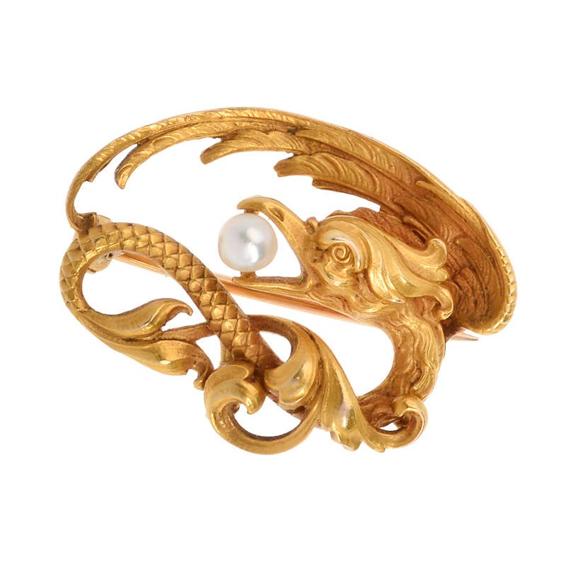 Dragons have long captivated the imagination of all. Mythical beasts, their presence spans eons and cultures throughout the world.Picking up this laden theme, the Art Nouveau jewelers revived this evocative motif. Rendered in 14k yellow gold, the imagery i