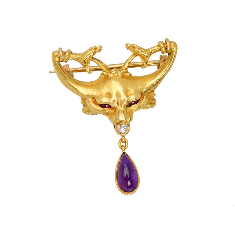 A lion, a goat, and two snakes comprise this outstanding Art Nouveau singular chimera jewel.