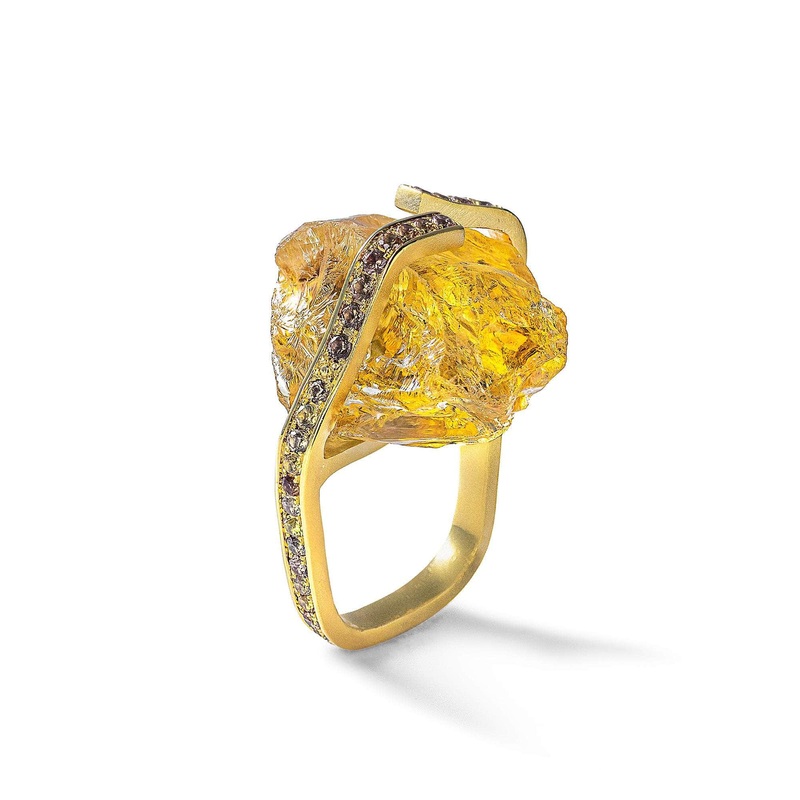 Presenting a hallmark statement ring that unmistakably reflects the style of our anarchist designer, . Crafted from 925 silver, plated with 18K gold, and paved with natural round-cut mixed-color sapphires, its core feature is a natural, unaltered citrine r