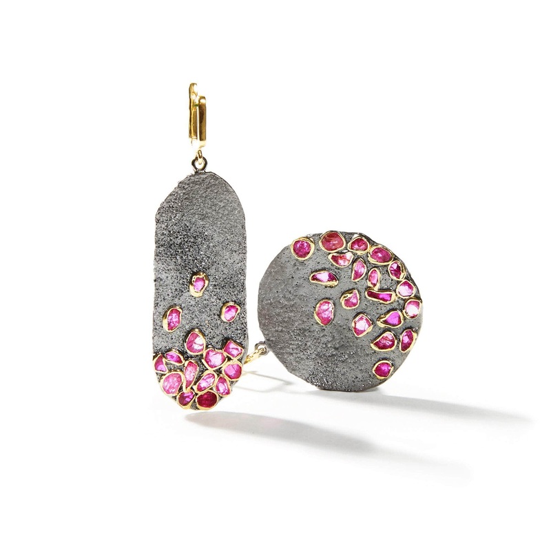 See-through raw natural ruby crystals in caleidoscope earrings: dynamically balanced and asymmetric in the way. This design is entirely handmade and individually crafted just for you. No identical copies are possible; your piece might differ slightly from the picture.