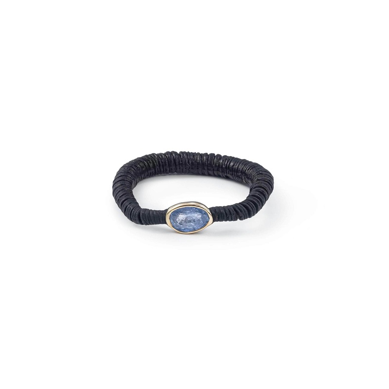 This stacking ring features an organic texture with a blend of 925 Silver for the band and 9K Gold for the cast, an unusual combination. It’s plated using the Anthracite method, resulting in a deep-black finish that contrasts elegantly with the Gold and other collection pieces. With a natural oval-cut Blue Sapphire as its centerpiece, this ring allows for versatile self-expression. Wear it alone for a minimalist touch or mix and match with other Shuffle designs to create your own mood.