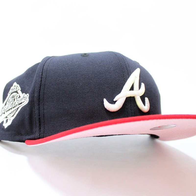 Atlanta Braves 1995 World Series New Era 59Fifty Fitted Hat in Navy and Red with a Pink Under Brim. Logo: Glow in the Dark.